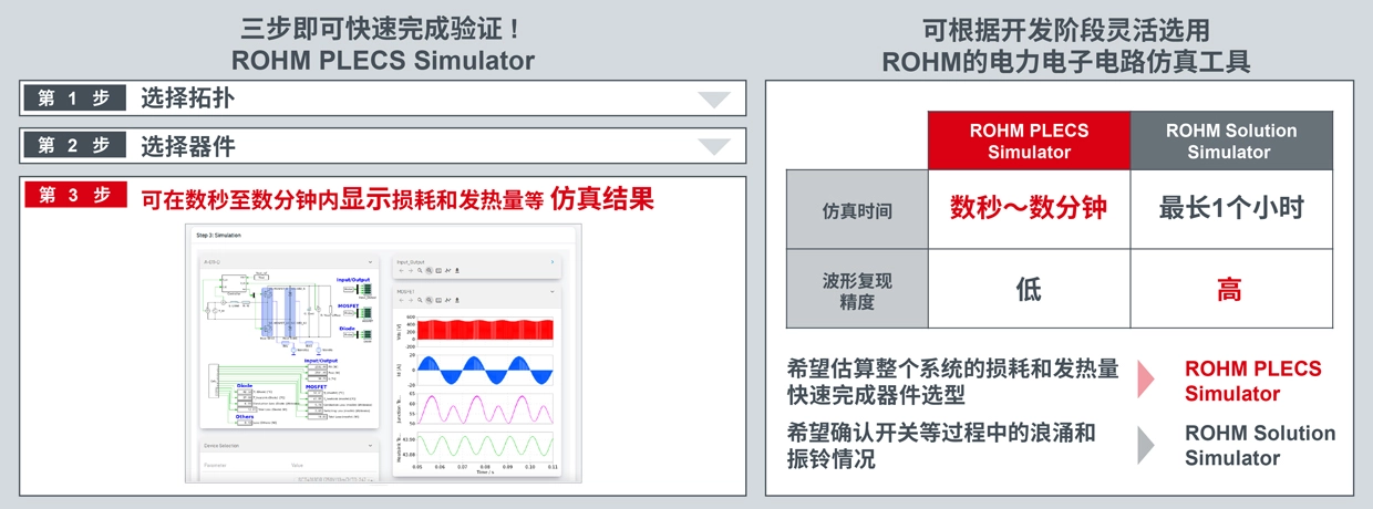 针对这一需求,ROHM推出了“ROHM PLECS Simulator”,专门用于损耗和热计算。用户可以利用PLECS®进行快速的初期探讨,运用“ROHM Solution Simulator”的优势进行详细且高精度的验证,并根据不同的开发阶段进行区分使用,进而实现从设计的损耗和发热验证到波形检查的一体化仿真。