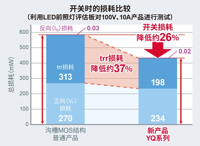 “YQ系列”是继以往支持各种电路应用的4个SBD系列之后推出的新系列产品,也是ROHM首款采用沟槽MOS结构的二极管。该系列利用ROHM自有的结构设计,实现了业界超快的trr(15ns),与同样采用沟槽MOS结构的普通产品相比,trr单项的损耗降低约37%,总开关损耗降低约26%,因此,有助于降低应用产品的功耗。另外,通过采用沟槽MOS结构,与以往采用平面结构的SBD相比,正向施加时的损耗VF*2和反向施加时的损耗IR*3均得到改善。这不仅可以降低在整流应用等正向使用时的功率损耗,还可以降低对于SBD而言最令人担心的热失控风险*4。这些优势使得该系列产品非常适用于容易发热的车载LED前照灯的驱动电路、xEV用的DC-DC转换器等需要进行高速开关的应用。