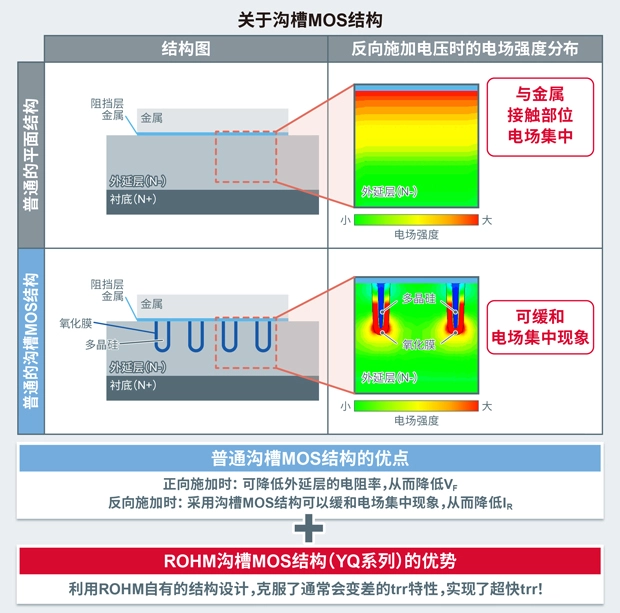 二极管的种类有很多,其中高效率SBD被广泛用于各种应用。尤其是沟槽MOS结构的SBD,其VF低于平面结构的SBD,因此可以在整流等应用中提高效率。而普通沟槽MOS结构的产品,其trr比平面结构的要差,因此在用于开关应用时存在功率损耗增加的课题。针对这种课题,ROHM推出采用自有的沟槽MOS结构、同时改善了存在权衡关系的VF和IR、并实现了业界超快trr的YQ系列产品。