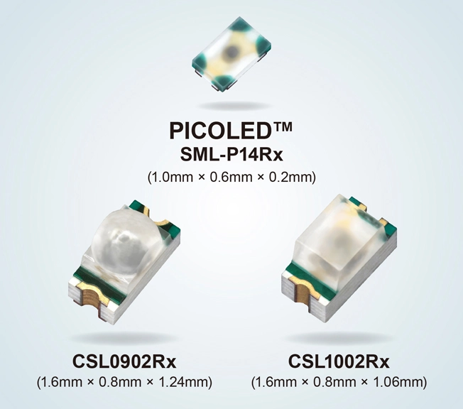 新产品共有3种封装,6款型号。超小(1.0×0.6mm)超薄(0.2mm)的PICOLED™系列*3有“SML-P14RW”和“SML-P14R3W”2款型号。业界标准尺寸(1.6×0.8mm)系列有窄指向角的圆透镜型“CSL0902RT”和“CSL0902R3T”以及宽照射范围的平透镜型“CSL1002RT”和“CSL1002R3T”共4款型号。每种封装都有850nm(SML-P14RW为860nm)和940nm两种波长,用户可根据应用需求进行选择。850nm波长与光电晶体管和相机感光元件之间的兼容性非常好,适用于VR/AR眼动追踪和物体检测等追求高灵敏度的应用,而940nm波长不易受阳光影响,发光时不会呈现红色,因此适用于人体感应传感器等应用。此外,在脉搏血氧仪等生物感测应用中,还可用于测量血流量和血氧饱和度(SpO₂)。