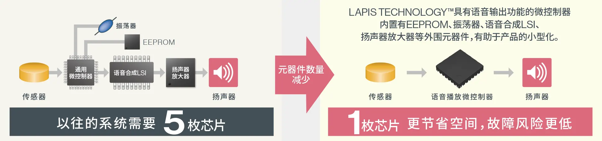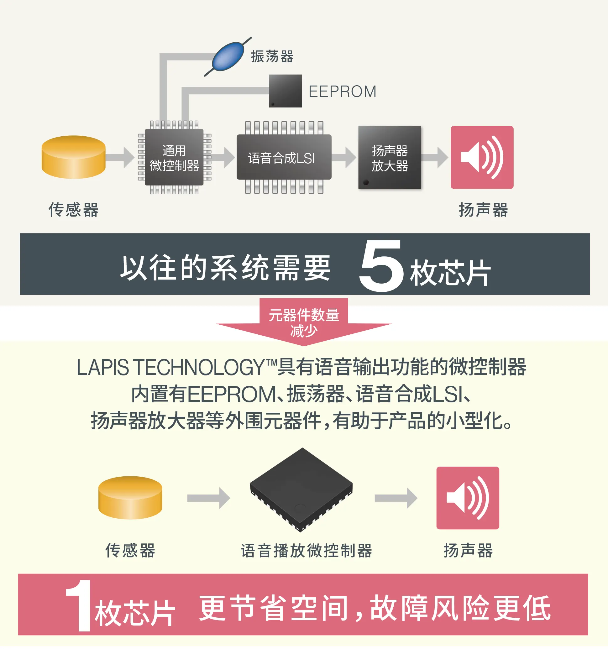 搭载了高音质的语音播放功能和高输出扬声器放大器,以单芯片实现了语音输出功能。与以往通过中间件实现的语音播放功能相比,音质更出色,也更易于控制,并且可以更大程度地发挥出微控制器的性能。