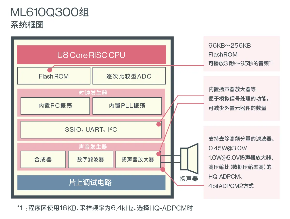ML610Q300组是内置LAPIS TECHNOLOGY™自有的RISC架构8bitCPU"U8 Core"的、具有语音输出功能的高性能CMOS 8bit微控制器。
