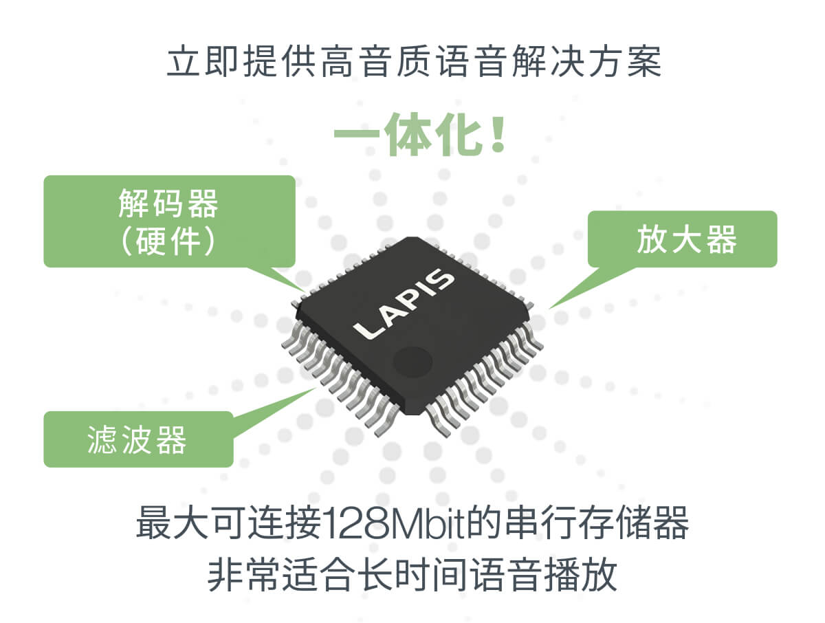 LAPIS TECHNOLOGY™的支持外挂存储器的语音合成LSI非常适合几十秒~几分钟左右的旋律和语音向导等应用,例如旋律、动物园和博物馆向导、使用说明书、治愈系用品、雷达探测器、童书等。
