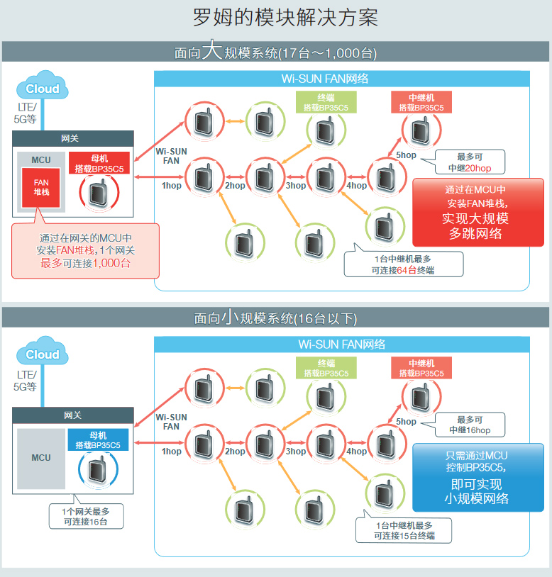 “BP35C5”在内置存储器中安装了Wi-SUN FAN用堆栈,无需外部MCU也可在网关上最多连接100台,简单构建小规模系统。