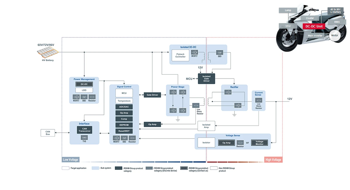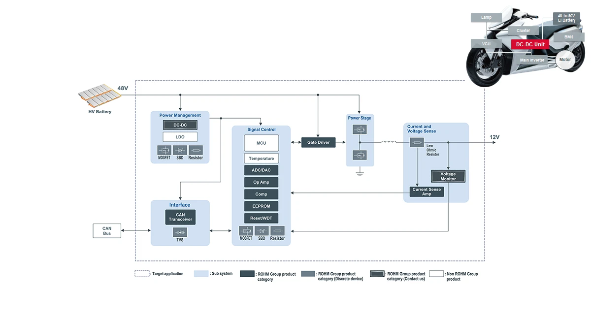 在电动摩托车中,DC-DC转换器发挥着重要作用,它能将电池供给的高电压转换为系统所需的低电压。