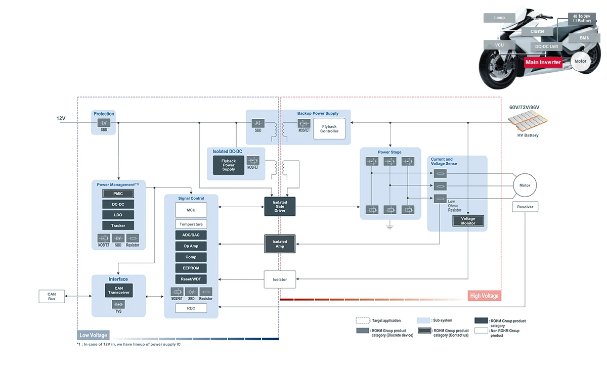 罗姆提供包括Si MOSFET、支持隔离的驱动IC、控制IC、电源IC、分流电阻器等在内的丰富产品阵容,助力实现单元的小型化和延长电动摩托车的续航里程。