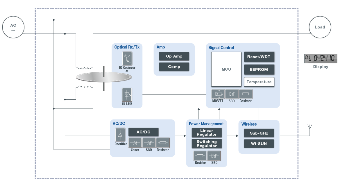近年来,电力供需形势紧张,智能电表已成为能够帮助用户和电力公司实现有效电力管理的重要设备,这就要求其具备对包括安全和通信在内的各种功能长期准确测量用电量的能力。罗姆通过提供可靠性高的运算放大器、低功耗的电源IC以及无线通信元器件,为数据检测和优化电源效率贡献力量。