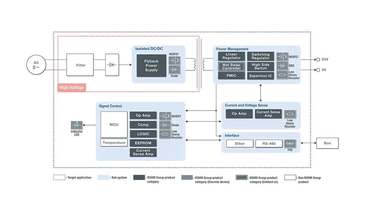 罗姆提供适用於工业设备电源系统的功率半导体、电源IC以及内置保护电路的IPD(智能功率器件)等产品。通过以高耐压产品为主的高可靠性解决方案,助力提高应用产品的稳健性并延长系统寿命。