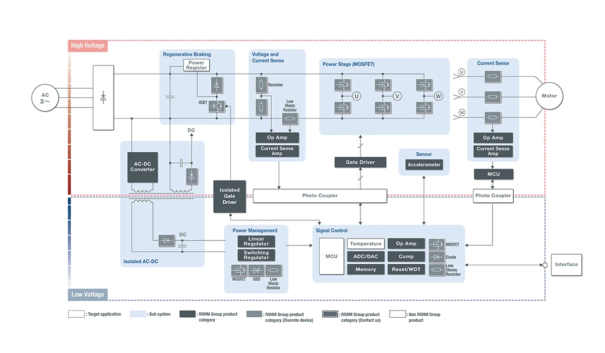 针对电机驱动,罗姆可提供以SiC MOSFET为主的先进功率半导体、高性能磁隔离栅极驱动器IC以及高精度分流电阻器等电源解决方案。另外,罗姆还拥有辅助电源用的电源IC等丰富的产品阵容,通过提供系统级的解决方案,为应用产品的高效运行和可靠性提升贡献力量。