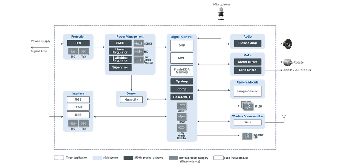 罗姆通过为安防系统提供可靠性高、具备安全功能的各种元器件,为创建安全、安心的生活环境贡献力量。