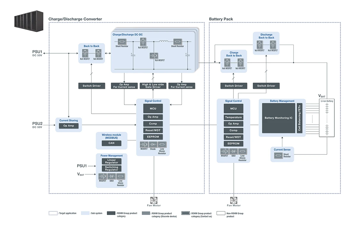 首先,在BBU(备用电池单元,用来在电源异常时保护数据)设计中,能够充分发挥锂离子电池性能的先进电池管理系统至关重要。罗姆提供可高精度监测电池健康状态(SoH)的电池电量监控IC(电量计IC)等产品,助力BBU的小型化和可靠性提升。