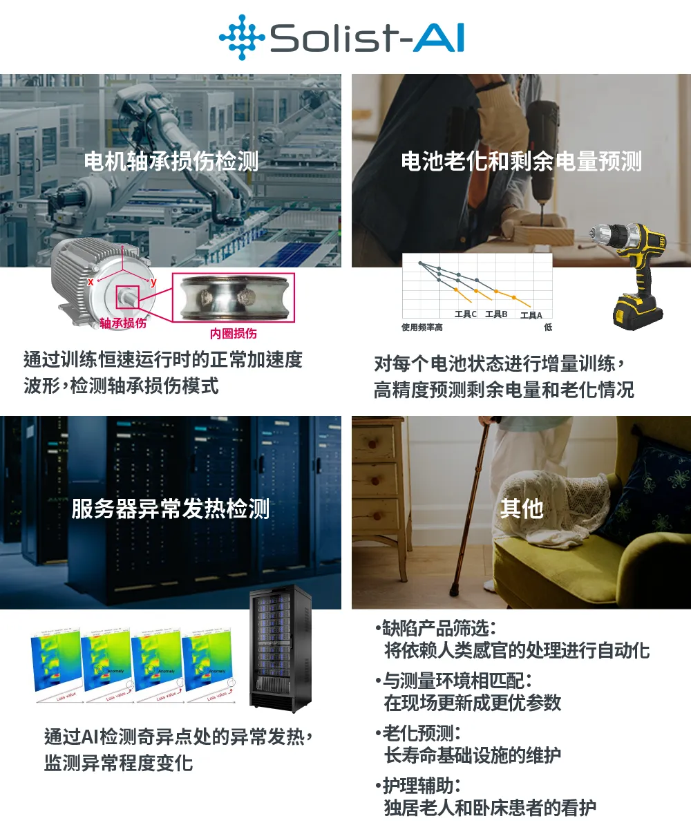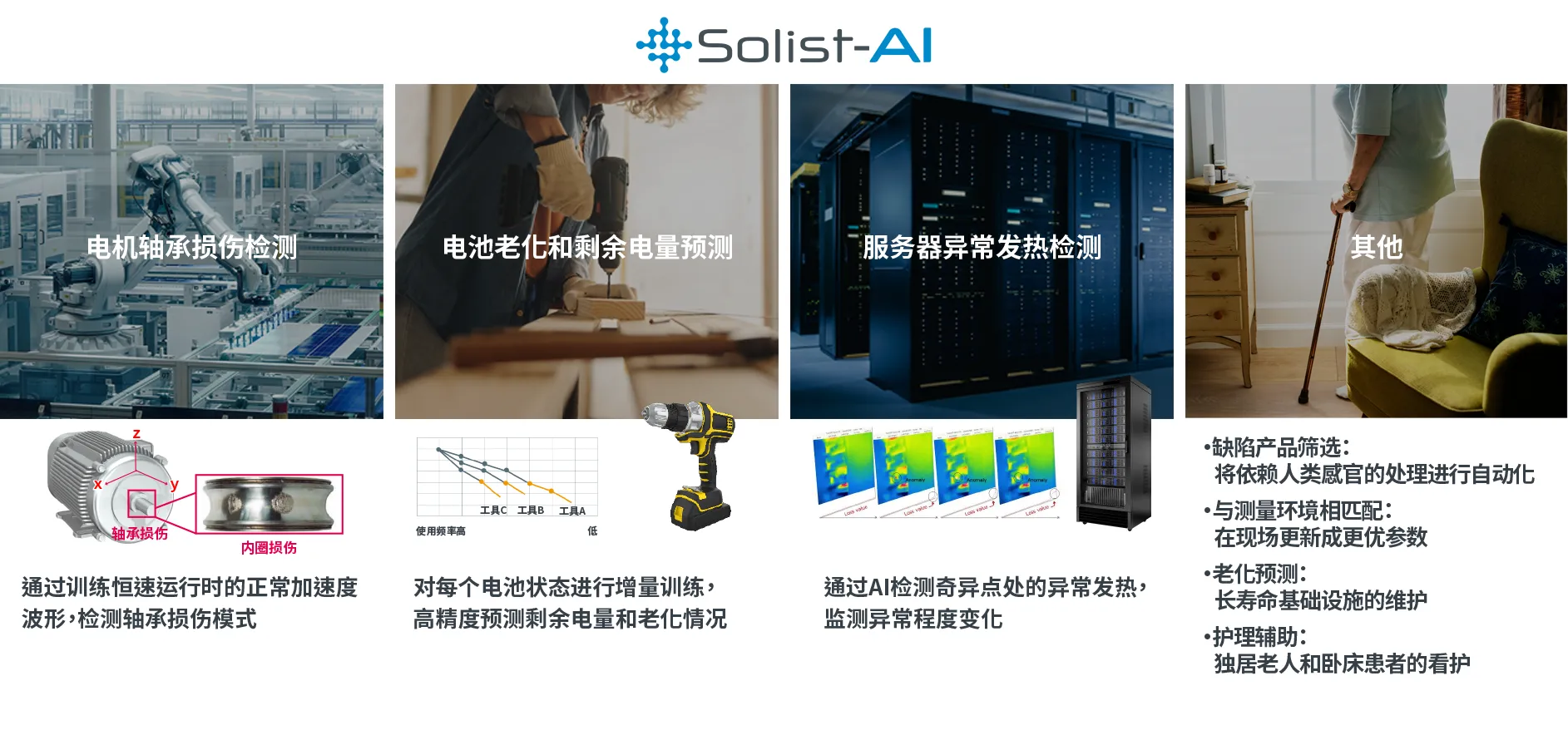 Solist-AI™解决方案可在边缘计算领域的各类设备中实现基于AI技术的状态监控和劣化预测等功能。由于支持在现场独立工作的训练,因此即使在没有通信环境的地方,只需连接传感器也可轻松构建系统。