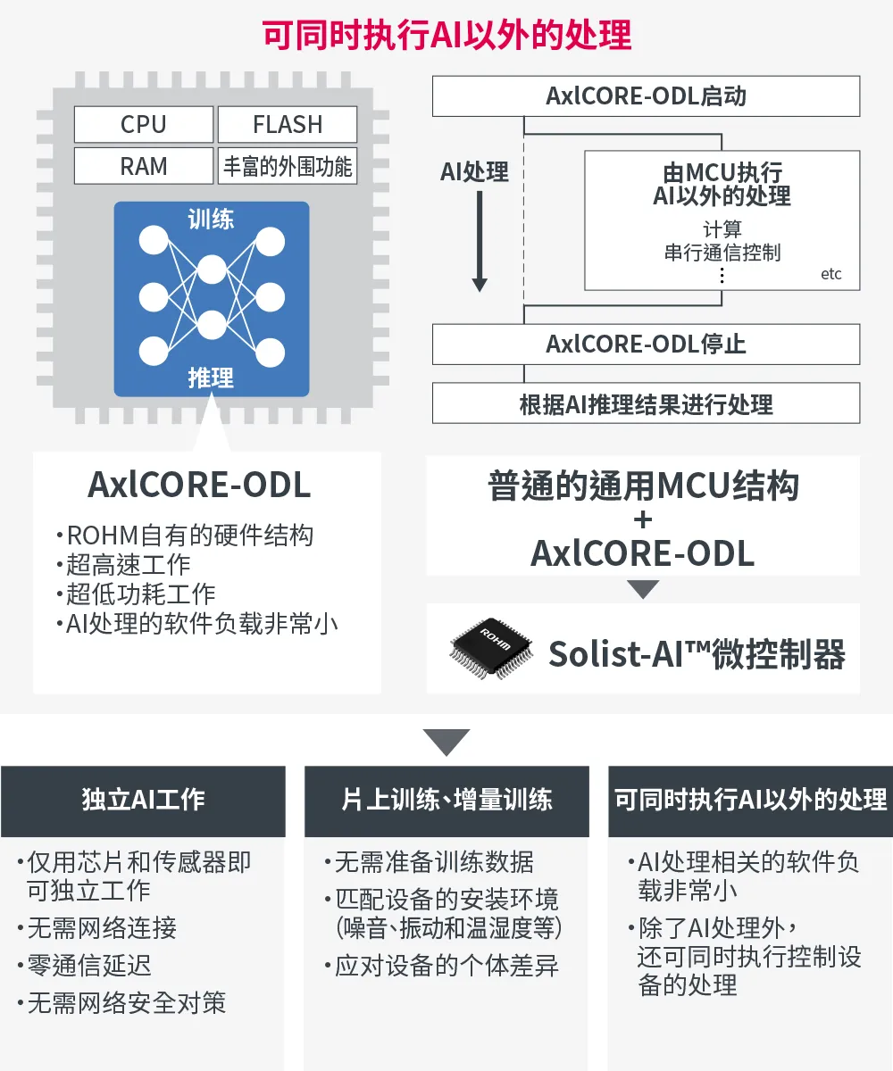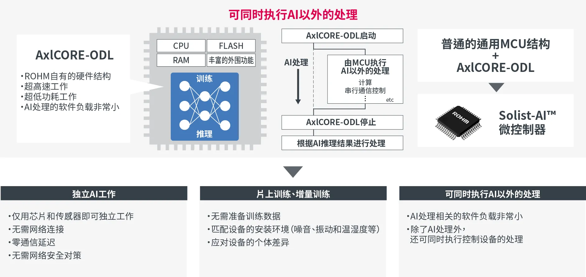 Solist-AI™通过采用配有AxlCORE-ODL的Solist-AI™微控制器,具有“独立AI工作”、“设备端学习和增量训练”以及“同时执行AI以外的处理”的特点。