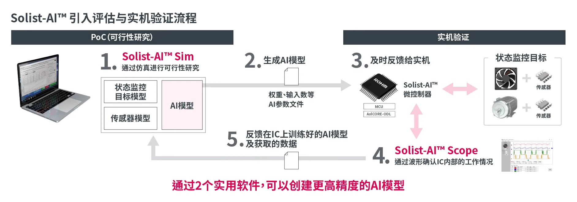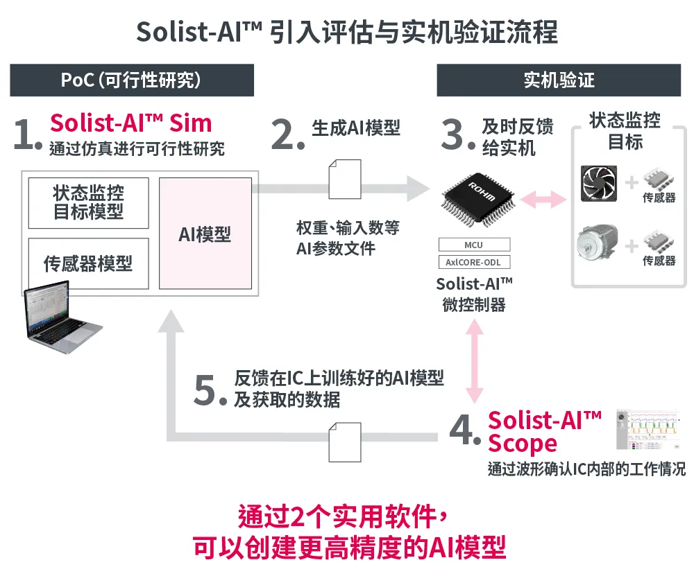 为了让用户能够立即评估Solist-AI™,ROHM已经在官网上公开发布了在可行性研究和实机验证的各个阶段进行AI工作分析所需的全套支持环境(实用软件)。