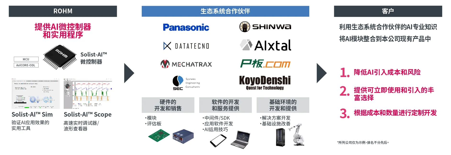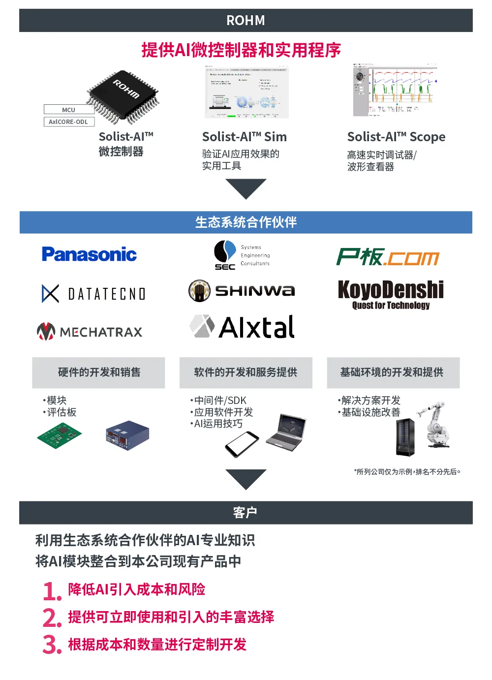 Solist-AI™解决方案并非ROHM的独立项目,而是与多家生态系统合作伙伴联合提供的。从硬件和软件开发到基础环境的开发与提供,我们将提供全方位支持,助力客户能够快速使用和引入产品。 另外,为了通过Solist-AI™推动AI创新和扩展,ROHM正持续招募生态系统合作伙伴。诚邀有意向者随时与我们联系。