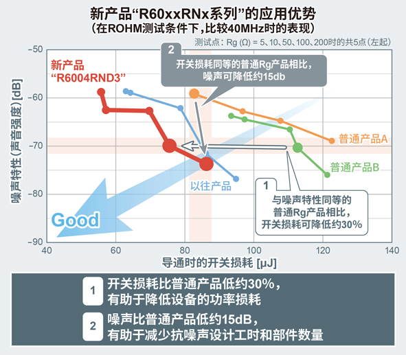 另外,通过采用新开发的自有Super Junction结构,与普通产品相比,与反向恢复时间之间存在权衡关系的噪声也降低了约15dB(在ROHM测试条件下,比较40MHz时的表现)。有助于减少设备的抗噪声设计工时和部件数量。