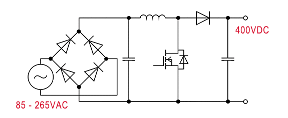 这是由单个升压转换器组成的最简单和最常用的 PFC 电路。通过开关操作可以产生所需的电流波形,并使功率因数接近于1。